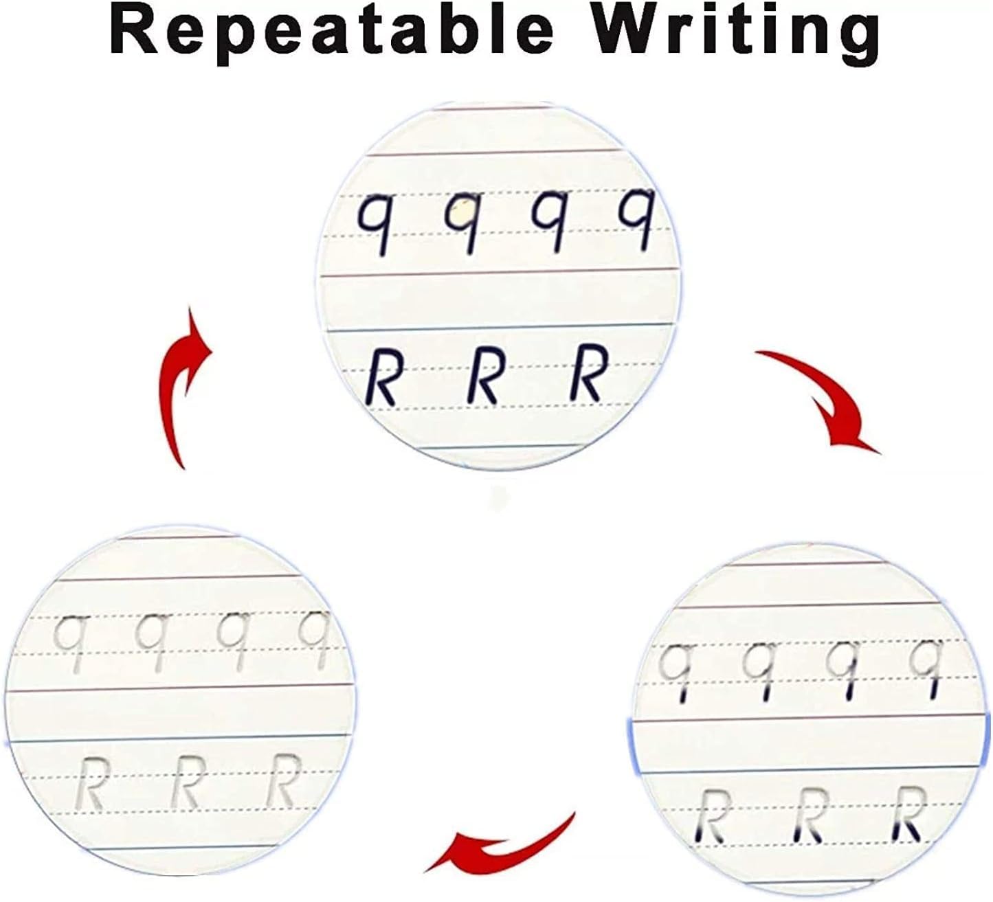 2: REUSABLE MAGIC COPYBOOK: ✎ Containing high quality, thick and durable pages made to last. Includes a magic refill pen that uses invisible ink, writing will disappear automatically after 15 minutes of writing and can be reused again.